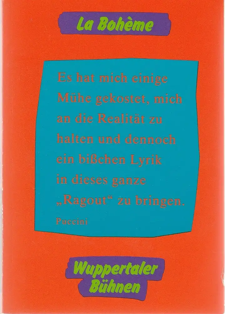 Szenen aus Henry Murgers Vie de Boheme in vier Bildern von Giuseppe Giacosa und Luigi Illica. Deutsch von Hans Swarowsly. Kritische Ausgabe herausgegeben von Francesco Degrada. Musikalische Leitung: Stefan Klieme. Inszenierung: Friedrich Meyer-Oertel. Bühne: Harald Thor. Kostüme: Dorin Kroll. Mitwirkende: Malina Pawlowa / Jennifer Trost, Melba Ramos / Claudia Visca, Lawrence Bakst, David Rice, Ole Jörgen Kristiansen, u. a. - Theaterprogramm, Opernprogramm, Ballettprogramm, Musicalprogramm, Konzertprogramm, Theatermemorabilia, Programmhefte Sammlung, deutsche Theatergeschichte.