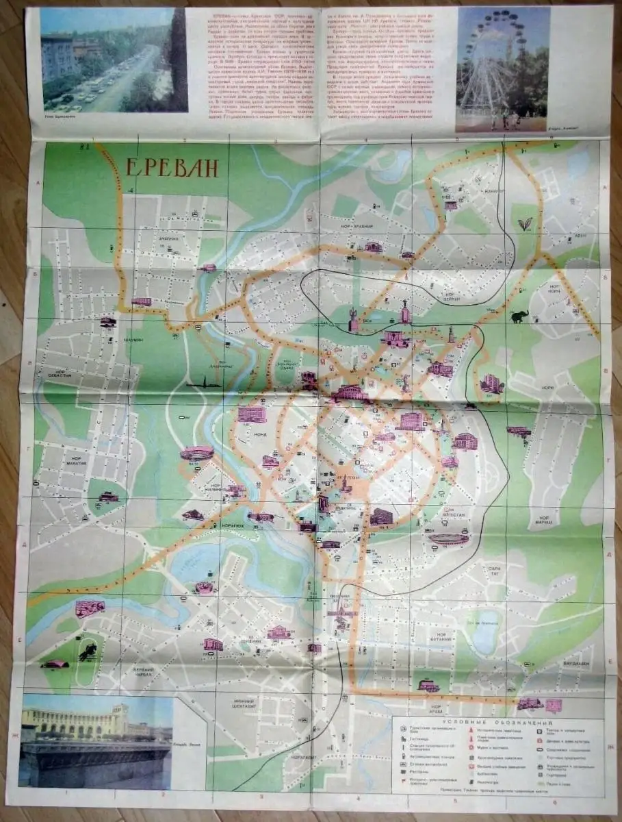 sehr guter Zustand, geringe Gebrauchs- und Alterungsspuren: Ecken teils leicht eselsohrig / knittrig, Stadtplan der armenischen Hauptstadt mit vielen Infos in russischer Sprache, Papier, ca. 11,5 x 24,5 (aufgeklappt ca. 68 x 49), 24 Seiten mit 6 Bildern und großem Stadtplan