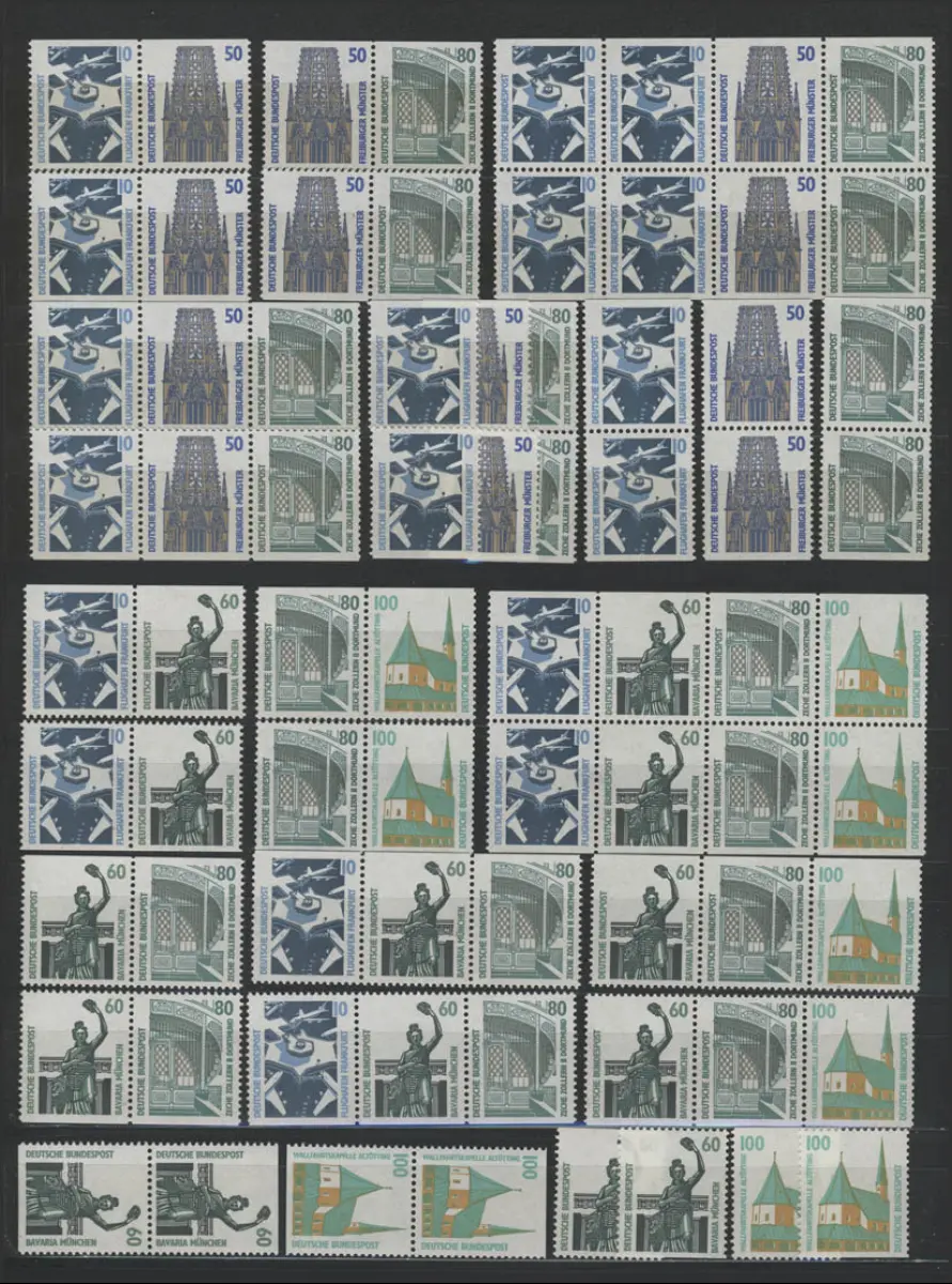 Komplettes Set "Sehenswürdigkeiten" mit allen Zusammendrucken mit der gelblichen Gummierung u nach MICHEL. Mit den C/D-Paaren, Einzelmarken und mit den Heftchenblättern.