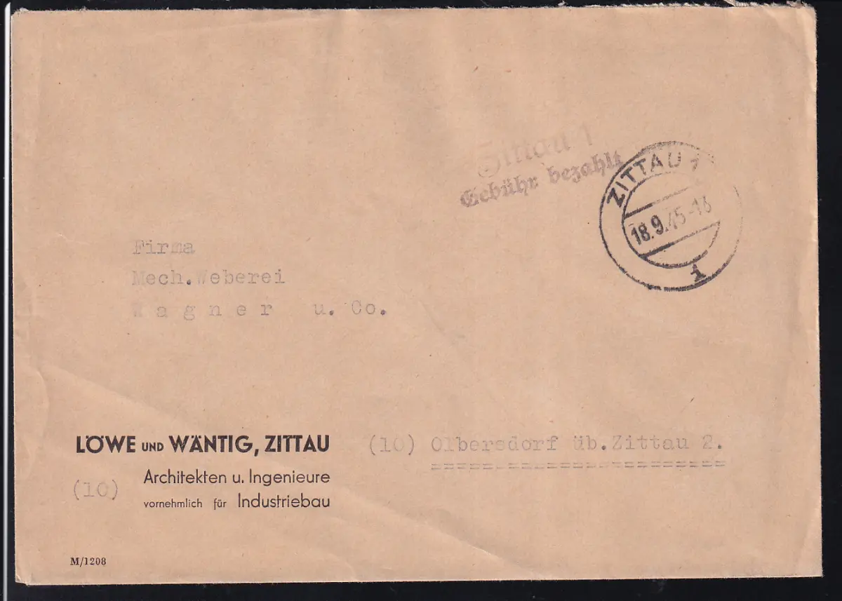 ZITTAU 1 i 18.9.45 + L2 Zittau 1 Gebühr bezahlt auf Firmenbrief (Löwe und Wäntig, Zittau)