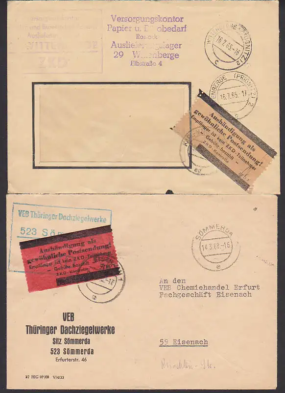 ZKD 7 roter und brauner Pergaminzettel, R3 Thüringer Dachziegelwerke Sömmerda, Z6 und R5 ZKD-St