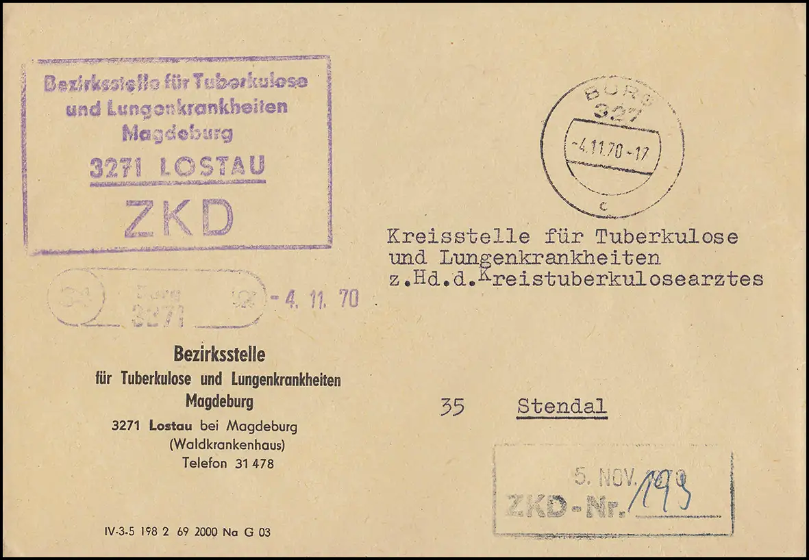 von der Bezirksstelle für Tuberkulose und Lungenkranheiten Magdeburg 3271 Lostau bei Magdeburg (Waldkrankenhaus) mit Poststellenstempel "34 Burg 3271" (Datumsstempel 4.11.70) an die Kreisstelle Tuberkulose und Lungenkrankheiten / Eingangsstempel 5.11.70 mit ZKD-Nummer 193 Ankunftsstempel STENDAL 5.11.70