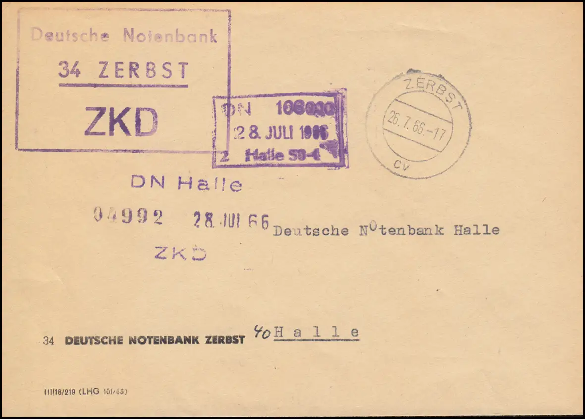 ZKD-Brief Deutsche Notenbank ZERBST 26.7.1966 an die DN in HALLE/SAALE 27.7.66