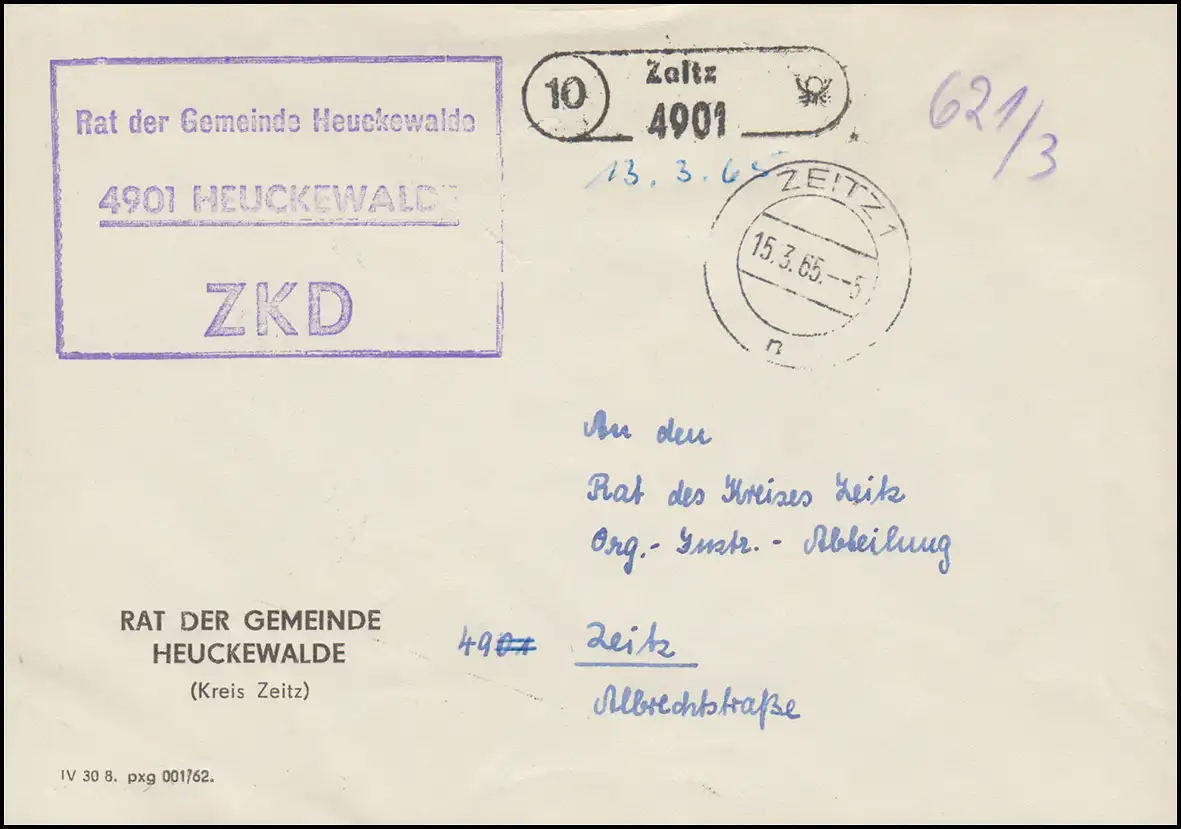 ZKD-Brief Rat der Gemeinde Heuckewalde als Orts-Brief ZEITZ 15.3.65