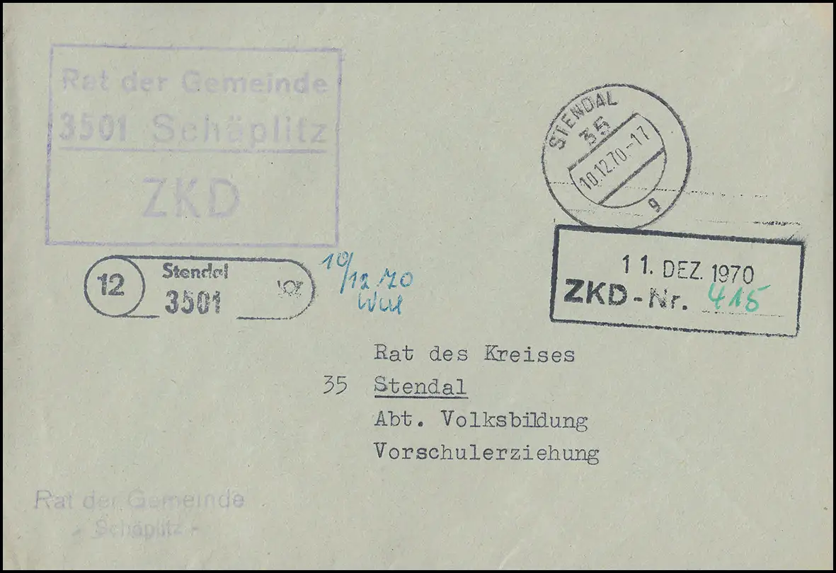 mit Poststellenstempel "12 Stendal 3501" (mit Signum und Datum handschriftlich) an den Rat des Kreises Stendal / Abteilung Volksbildung und Vorschulerziehung / Eingangsstempel 11.12.1970 mit ZKD-Nummer 415