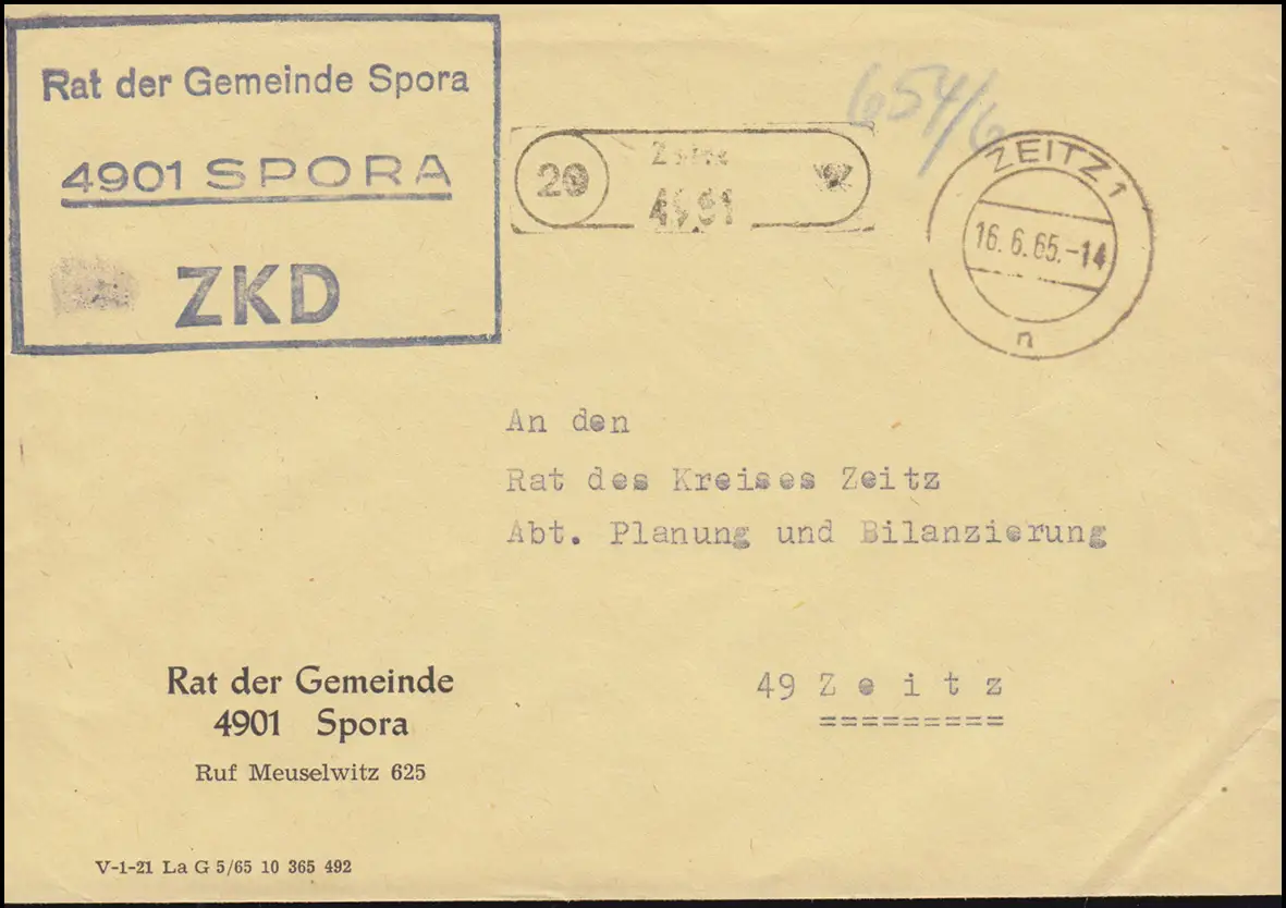 ZKD-Brief Rat der Gemeinde Spora als Orts-Brief ZEITZ 16.6.65 an Rat des Kreises