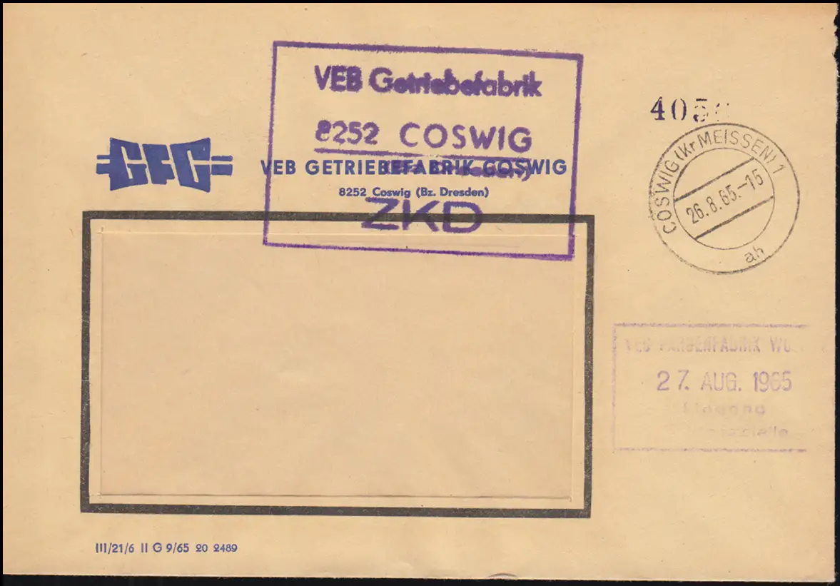 ZKD-Brief VEB Getriebefabrik COSWIG (Kr. MEISSEN) 26.8.1965 nach Wolfen