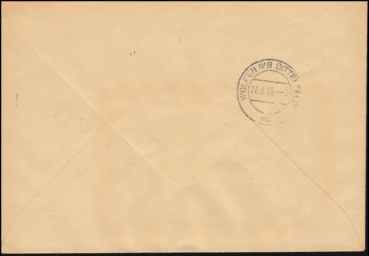 an den VEB Farbenfabrik Wolfen / Eingangsstempel 27.7.65, Fensterbriefumschlag, Ankunftsstempel WOLFEN (KR. BITTERFELD) 27.8.65