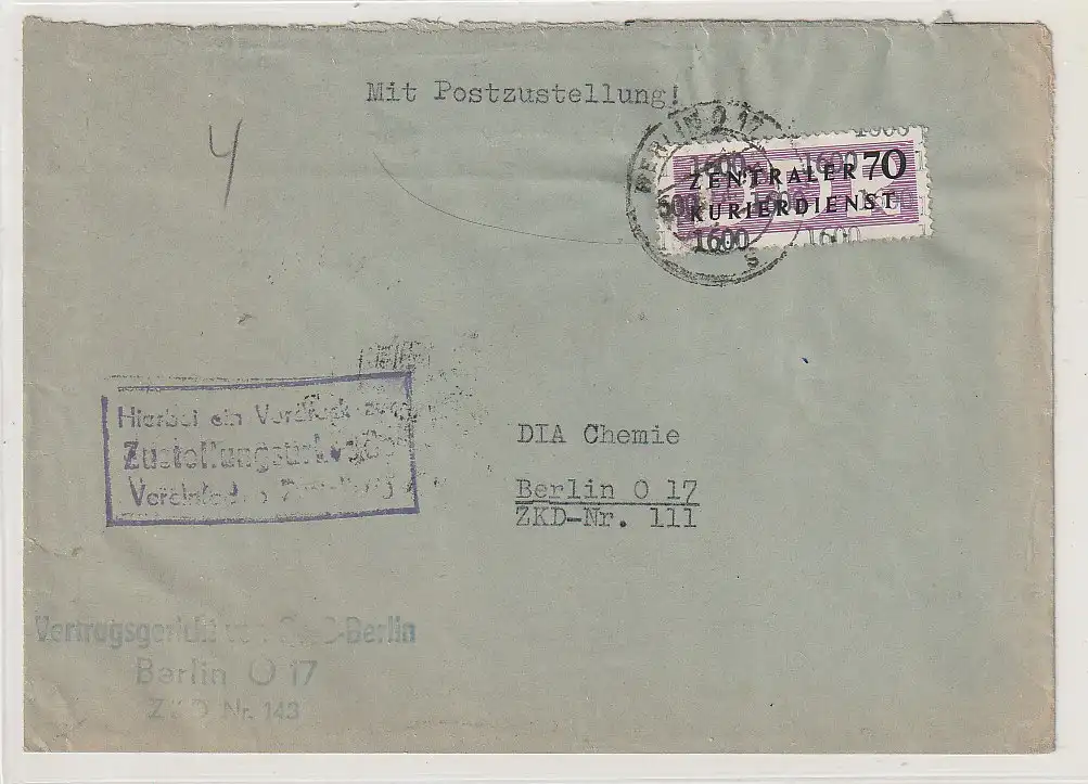ZKD-Brief mit Zustellurkunde, frankiert mit 13/1600, geprüft