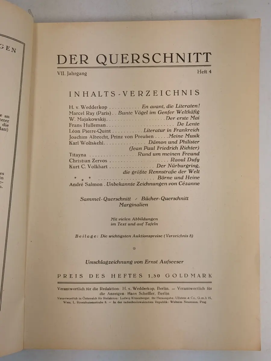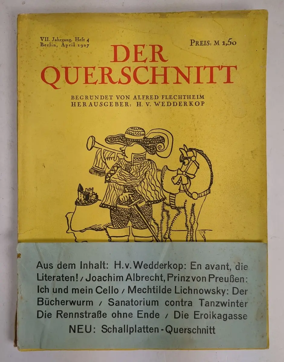 Bemerkungen: Zustand: Einband angestaubt und berieben, die Bauchbinde nur mit Vorderteil am Deckel vorhanden, der Vorderdeckel am Fuß des Rückens 8 cm angerissen, der Buchblock gut und sauber // Druck in einer Antiqua, mit zahlreichen Abbildungen und Illustrationen, u.a. von Grosz, Dufy und Sintenis, mit literarischen Beiträgen von H. von Wedderkop, Joachim Albrecht, Prinz von Preußen, Mechtilde Lichnowsky, Karl Wolfskehl u.a.