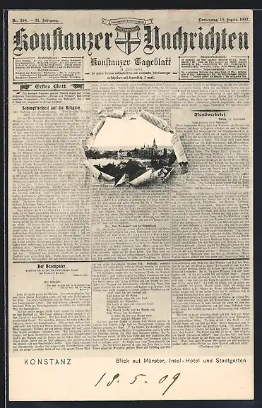 Zeitung-AK Konstanz, Blick auf Münster, Insel-Hotel und Stadtgarten, Ansicht in den Konstanzer Nachrichten
