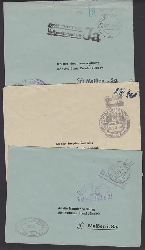 Zell a. M., Forbach (Baden, Schönwald(Oberpf) je Barfrankatur1946, dabei Gummist. Dein JA zum Volksentscheid!