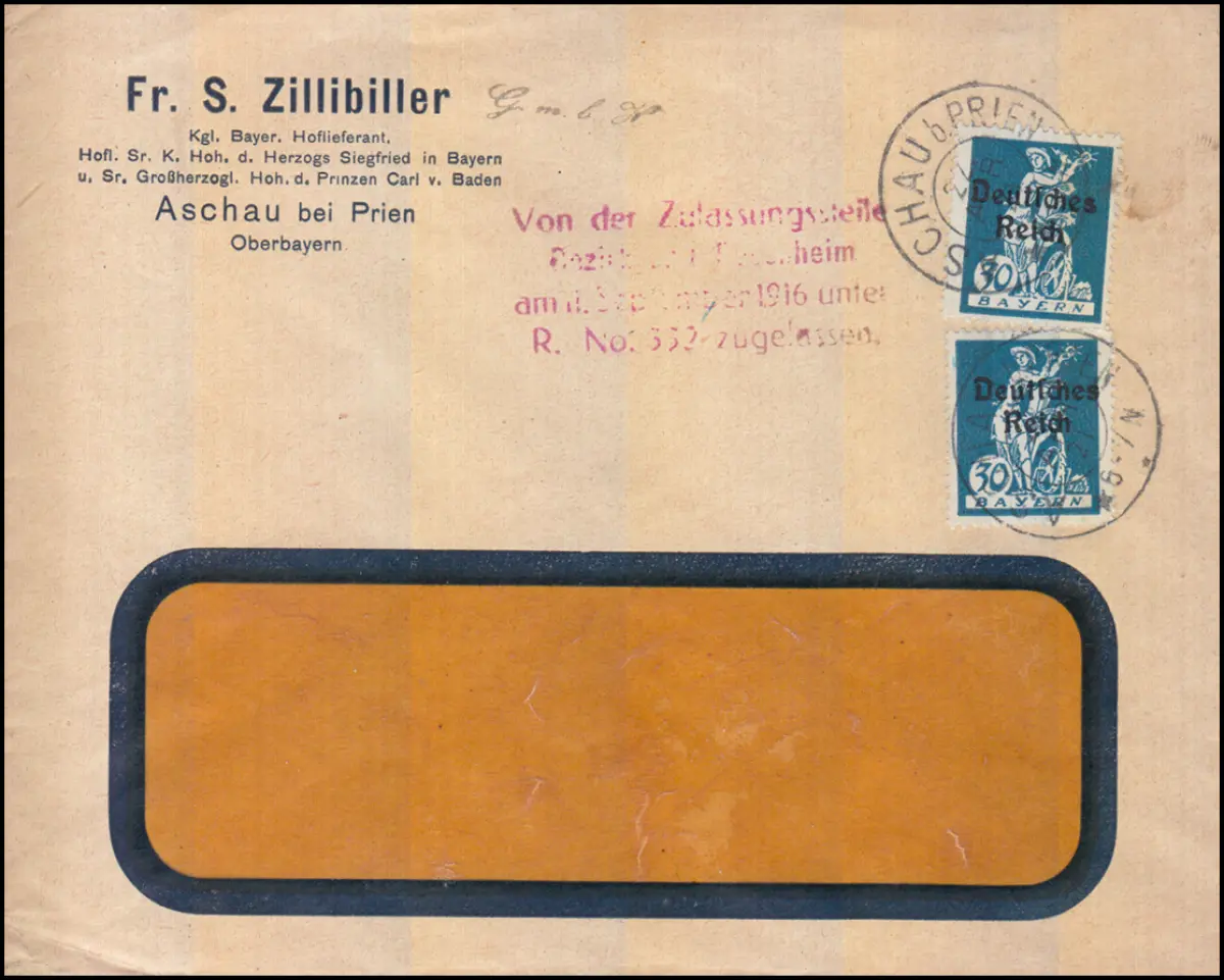 roter Zensurstempel "Von der Zulassungstelle ... Rosenheim am 11. September 1915 unter R. No. .... zugelassen",