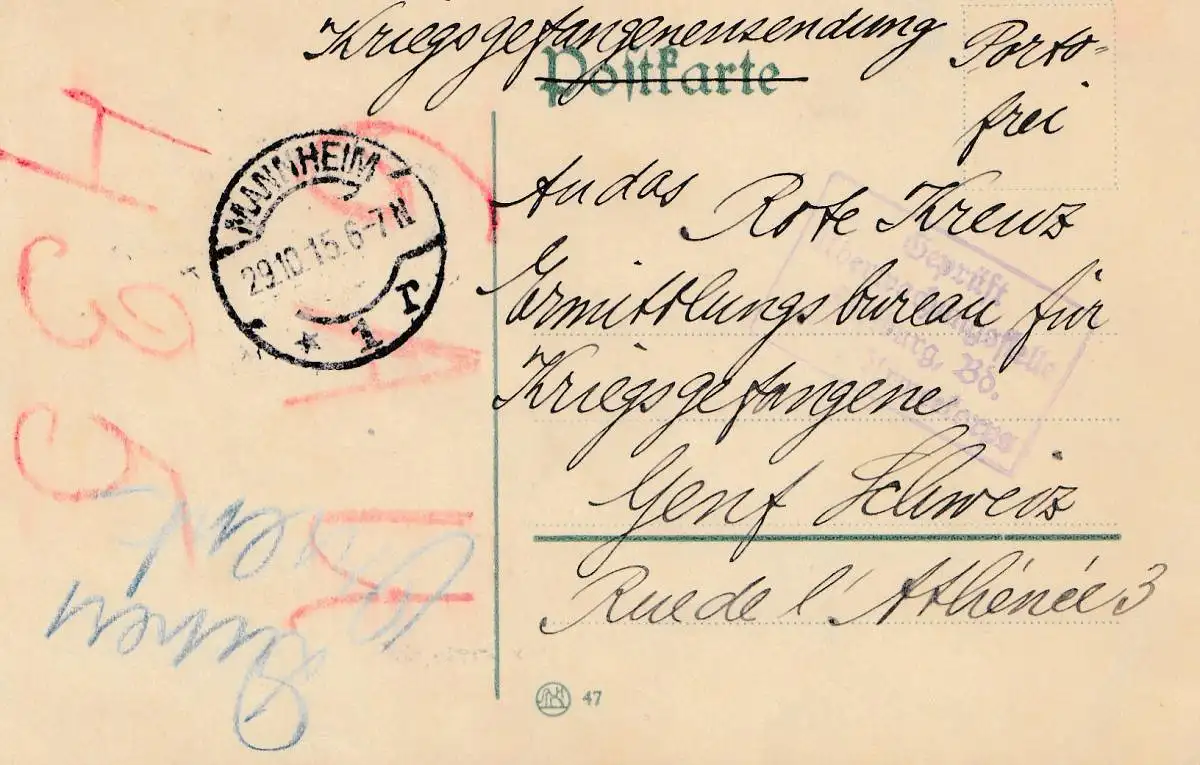 Zensur: 1915: Kriegsgefangenensendung von Mannheim in die Schweiz: Geprüft