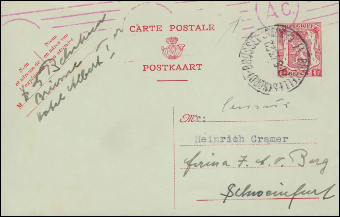 Zensur Belgien Postkarte P 199 Löwenwappen BRÜSSEL 21.5.1943 nach Schweinfurt