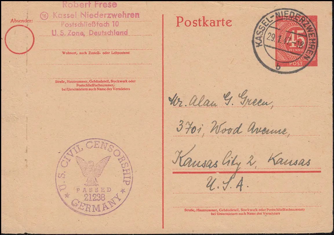 Zensur U.S. Civil Censorship 21238 auf P 955 KASSEL-NIEDERZWEHREN 29.1.1947