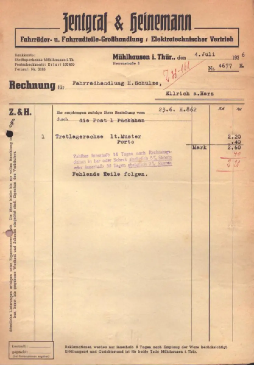 1 Seite DinA4 Fahrrad- und Fahrradteile Großhandlung, Mühlhausen i. Thür., Herrenstr. 6 Leichte Gebrauchsspuren, gelocht