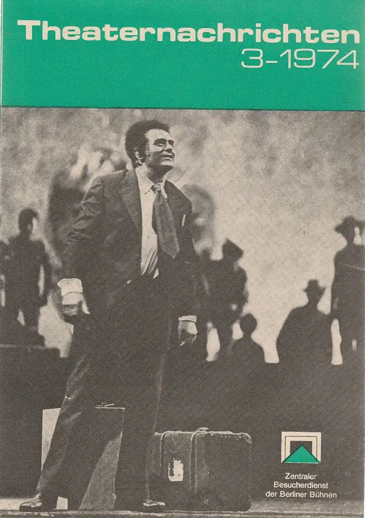 Inhalt: Welttag des Theaters 1974 / Mitteilungen / Deutsche Staatsoper Berlin: Theo Adam über seine neue Rolle / In Vorbereitung: Krieg und Frieden / Spielplan Distel Das Berliner Kabarett / Spielplan Friedrichstadtpalast / V. Warschauer Tage / Deutsches Theater: Kammerspiele Vom Abend bis zum Mittag, Die Millionärin Lisa Macheiner / Theater im 3. Stock der Volksbühne: Rote Unschuld oder Die Liste der Wohltaten / Maxim Gorki Theater Premiere am 24. Mär 1974 ERIK XIV. / Uraufführung im Theater der Freundschaft: Manana Manana / Spielplan Puppentheater Berlin - Theaterprogramm, Opernprogramm, Ballettprogramm, Musicalprogramm, Konzertprogramm, Theatermemorabilia, Programmhefte Sammlung, deutsche Theatergeschichte.