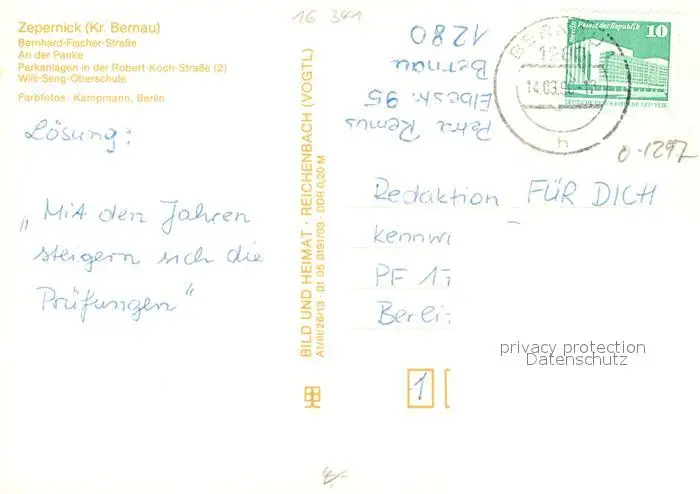 Zepernick Bernhard Fischer Strasse Panke Parkanlagen Robert Koch Strasse Zepernick postalisch gelaufen nach 1965 Erhaltung siehe scans [KathaD81] Kathoren
