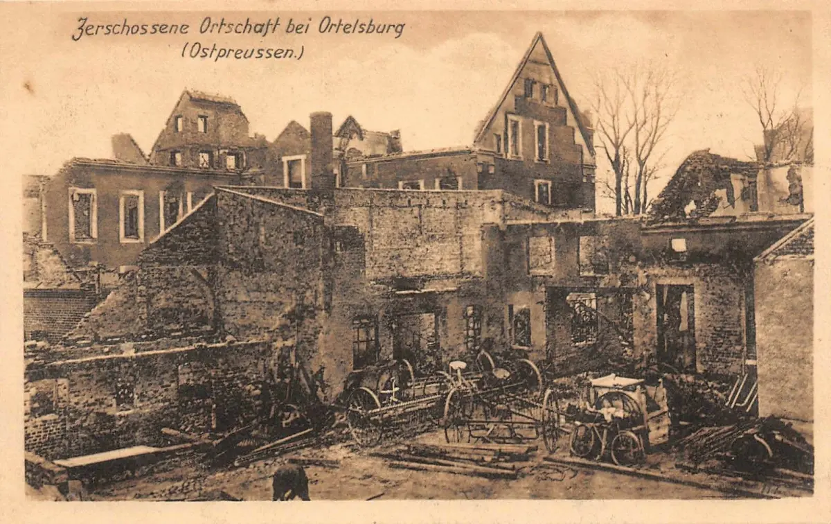 Zerschossene Ortschaft bei Ortelsburg (Ostpreussen) Postkarte AK