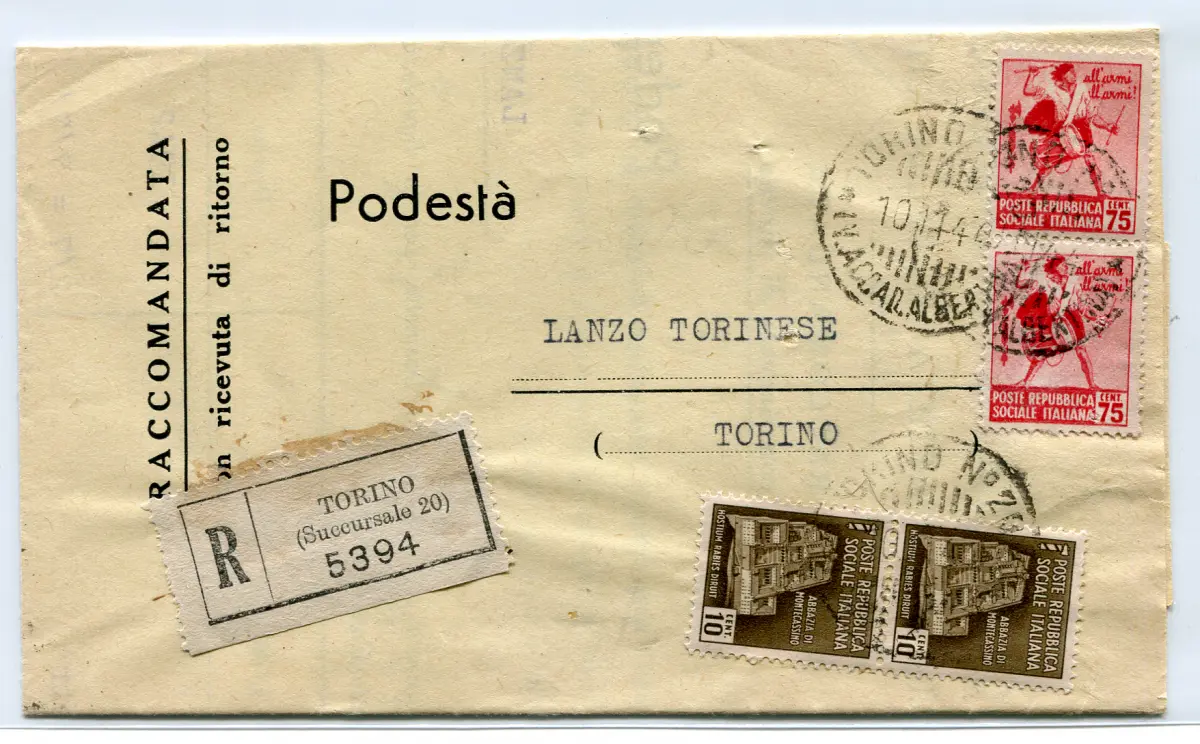 Zerstörte Denkmäler Cent. 75 Paar auf eingeschriebener Falz BÜSTE - Zerstörte Denkmäler Cent. 75 Nr. 499 Paar 503 Paar auf Falz empfohlen von Turin pro Stadt am 10.11.44 - Selten - Kat. 280 Cod. 231/16