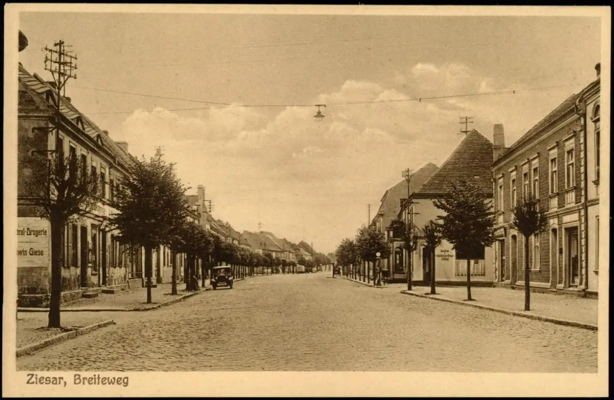 Ziesar Breiteweg Strasse Auto, Geschäft, Wohnhäuser b Potsdam Mittelmark 1910