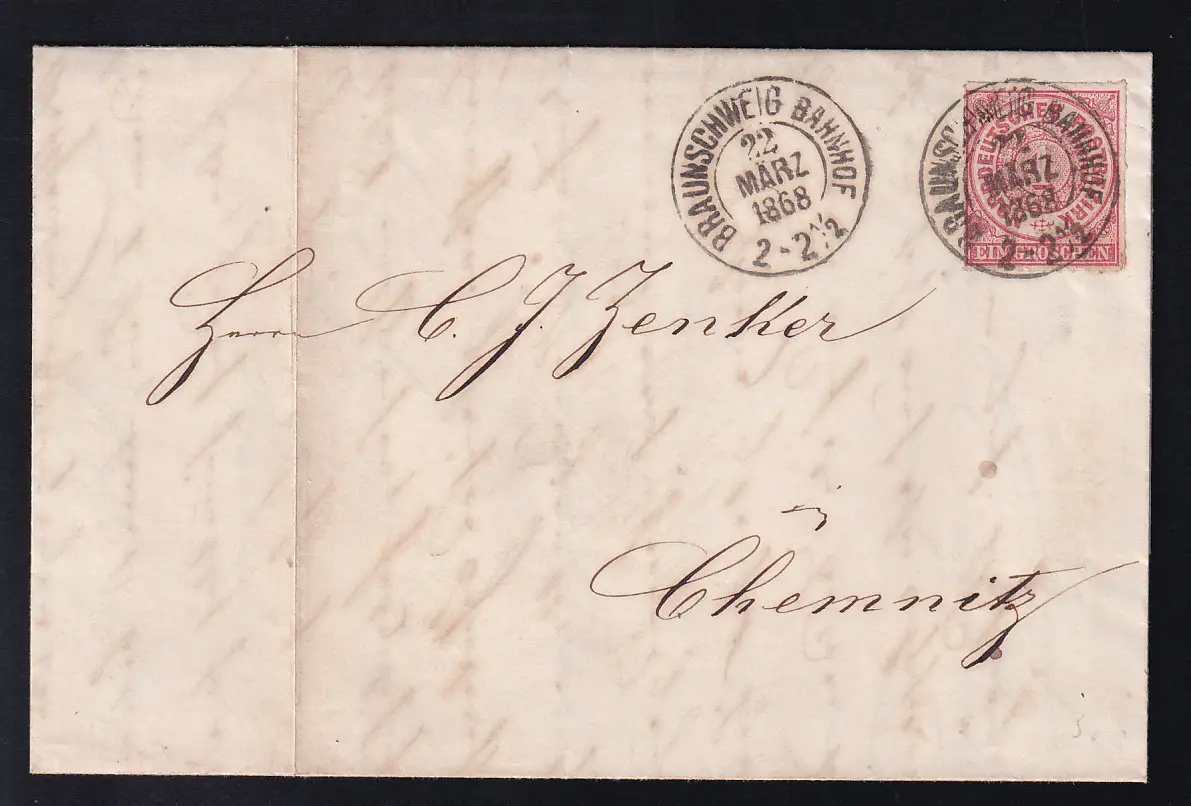 Ziffer 1 Gr. auf Brief mit K2 BRAUNSCHWEIG BAHNHOF 22 MÄRZ 1868 nach Chemnitz