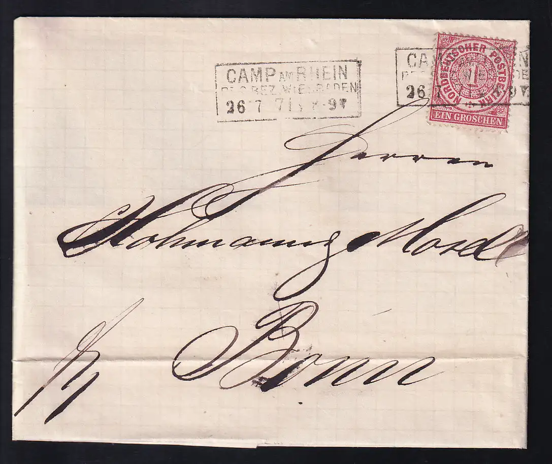 Ziffer 1 Gr. auf Briefhülle mit R3 CAMP AM RHEIN REG. BEZ. WIESBADEN 26.7.71