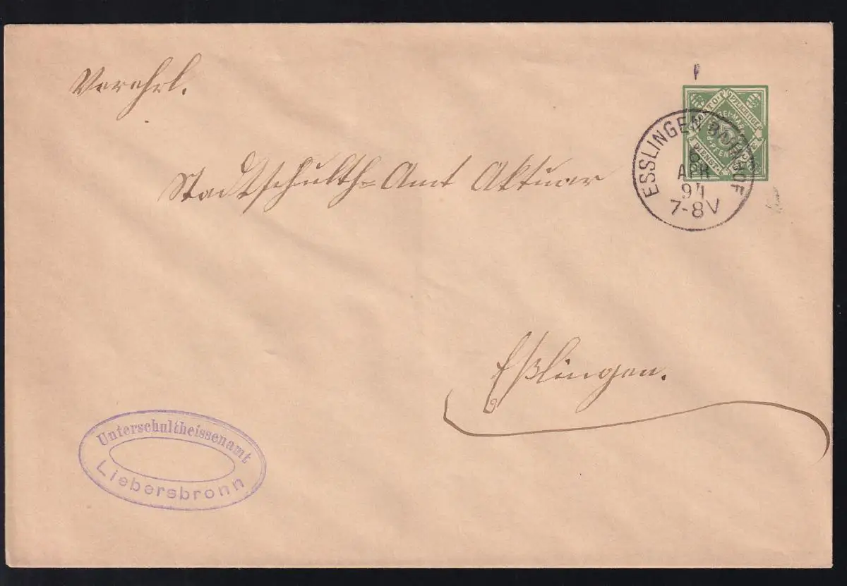 Ziffer 5 Pfg. als Brief des Unterschultheissenamt Liebersbronn mit K1 ESSLINGEN-BAHNHOF