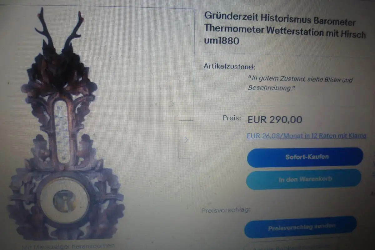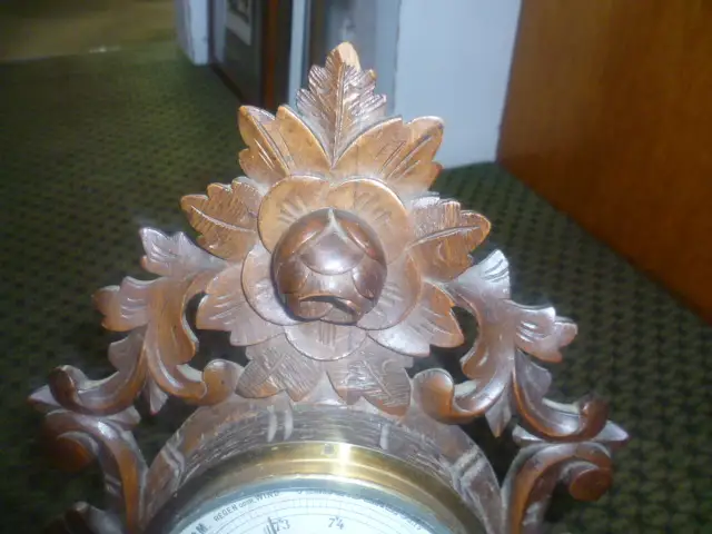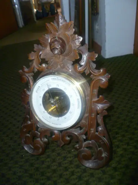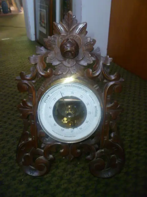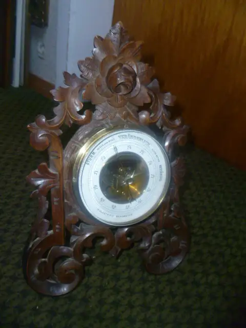 Hand geschnitzter Schwarzwald Tisch Kommoder Gründerzeit Historismus Barometer Thermometer zum Aufstellen Wetterstation mit Rosen Schnitzerei um1880 Holosteric Barometer