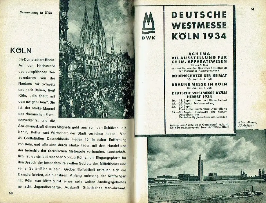 guter Zustand, geringe Gebrauchs- und Alterungsspuren: Falz oben minimal und unten ca. 1 cm eingerissen - Umschlag und Seiten teils etwas eselsohrig - Papier teils etwas vergilbt, aber Seiten überwiegend sauber und ordentlich, gelegentlich gering fleckig, Herausgeber - Allgemeine Bemerkungen - „Zum Rhein!“ - Vom Strom und seinen Schiffen - Rheindampferfahrt - Besteigt rheinische Burgen - Wanderung in rheinischen Gebirgen - Kraft und Freude in rheinischen Bädern - Die Weine des Rheinlandes - Städtetexte - Deutsch die Saar immerdar - Was ist im Sommer 1934 am Rhein los? - Fahrplan der Köln-Düsseldorfer Rheindampfschiffahrt - Hotelverzeichnis - Bonner Verkehrsgesellschaft - Kraftwagenverkehr der Reichspost - Kraftverkehr Wupper-Sieg, AG - Kraftverkehrsgesellschaft m. b. H., Koblenz - Berghotel Rittersturz, Koblenz, mit Drahtseilbahn - „Rhein“ Auto- und Verkehrsgesellschaft, Koblenz - Moseltalbahn, AG, Trier, kartoniert, ca. 12 x 18, 160 Seiten mit zahlreichen Bildern und 2 Karten innen im Umschlag