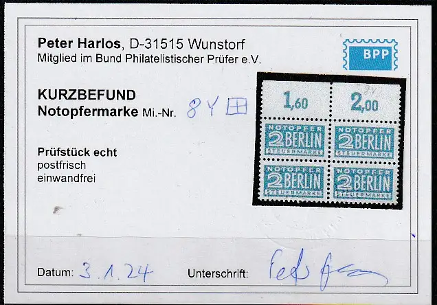 Zwangszuschlagmarke 8Y im ** Viererblock, Befund