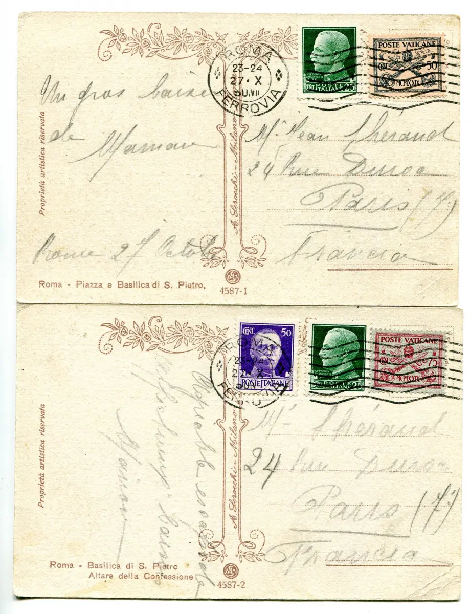 - Zwei illustrierte Ansichtskarten von Rom nach Paris am 27.10.30 gemischt frankiert Italien/Vatikan mit Reichsbriefmarke - Ungewöhnliche Nr. 1250/A