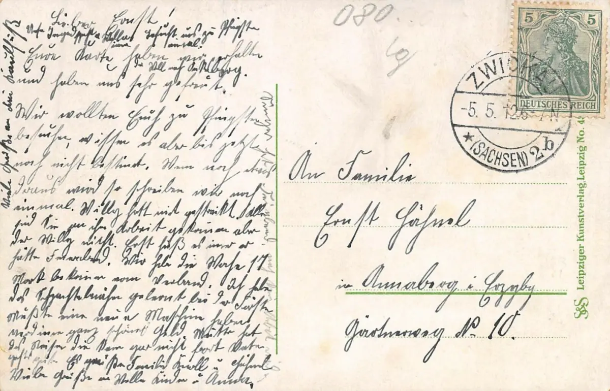 Original Postkarte Maße 9 x 14 cm Rückseite: g elaufen 1912 von Zwickau (Sachsen) Zustand: leichte Gebrauchsspuren