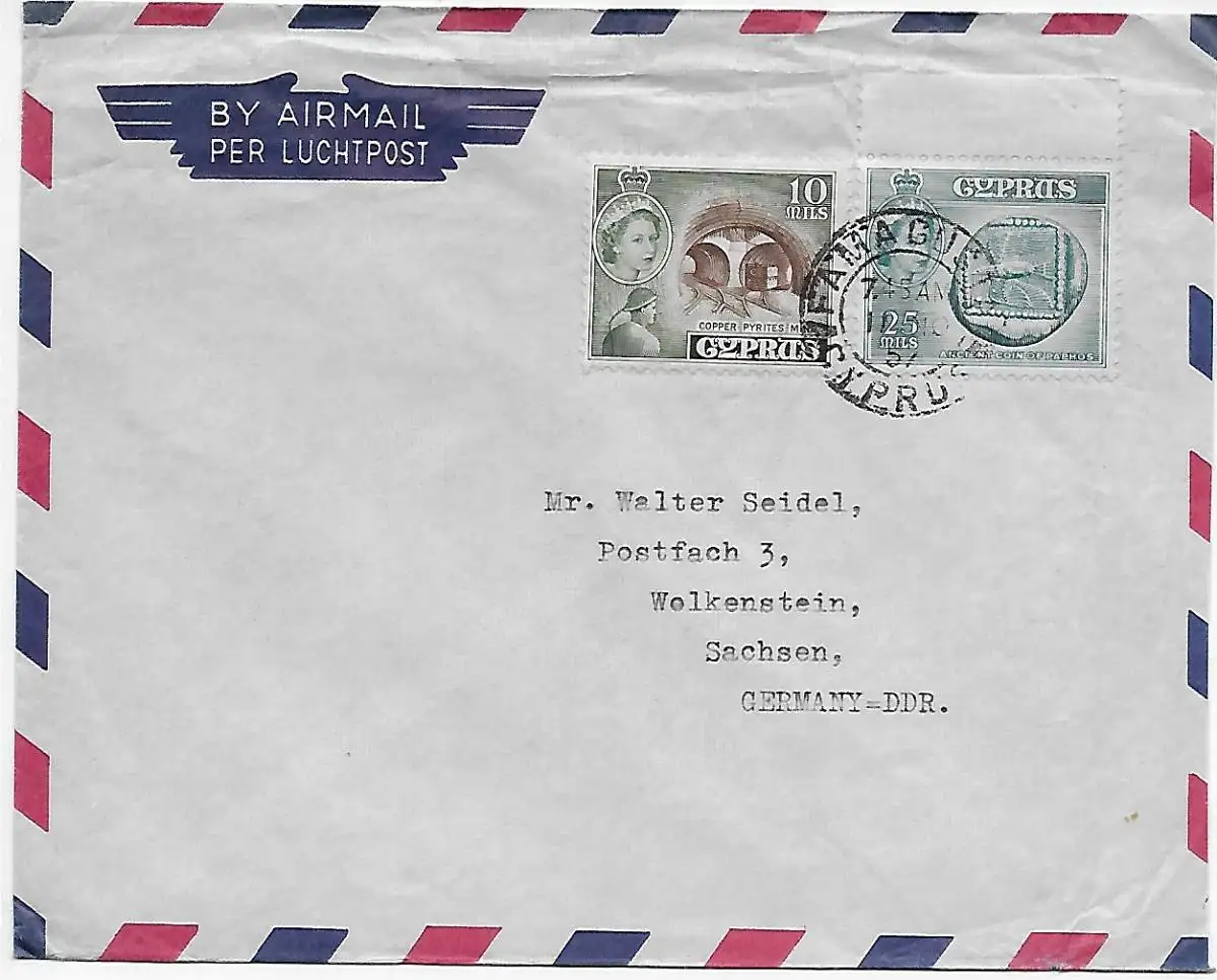 Zypern Famagusta 1957 nach Wolkenstein, Luftpost, ehemalige GB Kolonie