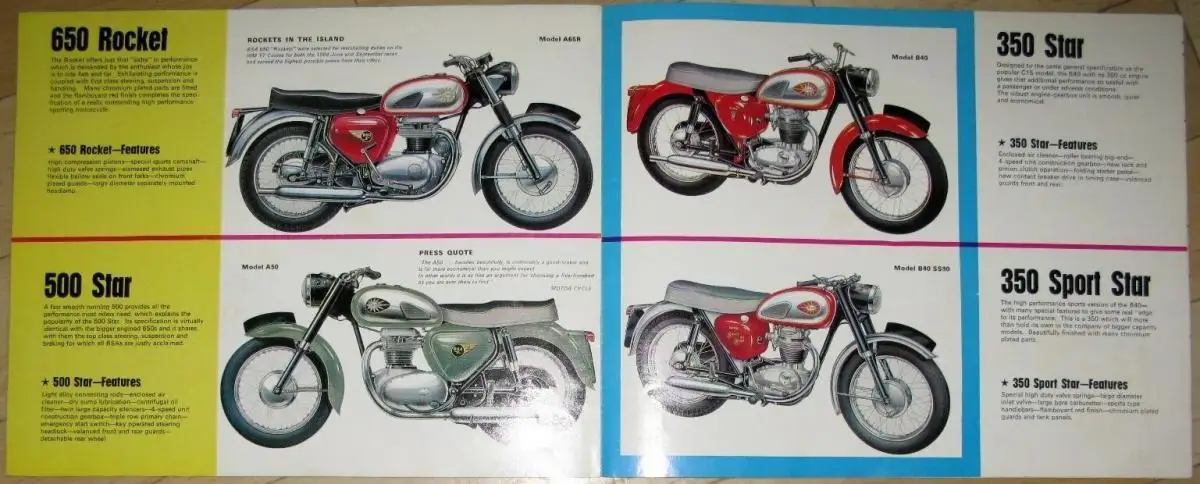 sehr guter Zustand, geringe Gebrauchs- und Alterungsspuren, Prospekt für 75 Beagle, 175 Bantam, 250 Star, 250 Sport Star, 350 Star, 350 Sport Star, 500 Star, 650 Star und 650 Rocket in englischer Sprache, Papier, ca. 25,5 x 20,5, 12 Seiten mit 21 Bildern