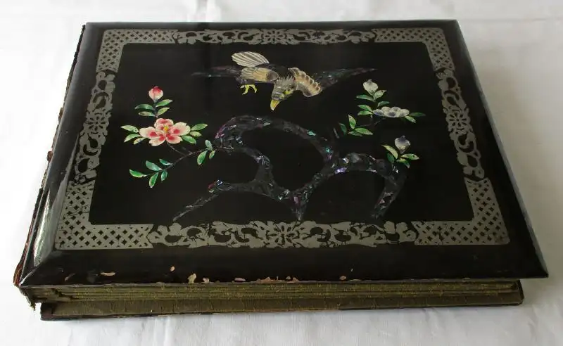 57 Postkarten mit japanischen Motiven in einem hochwertigem Album mit Perlmutt besetztem Deckelbild, gute gebrauchte Erhaltung siehe Bild,