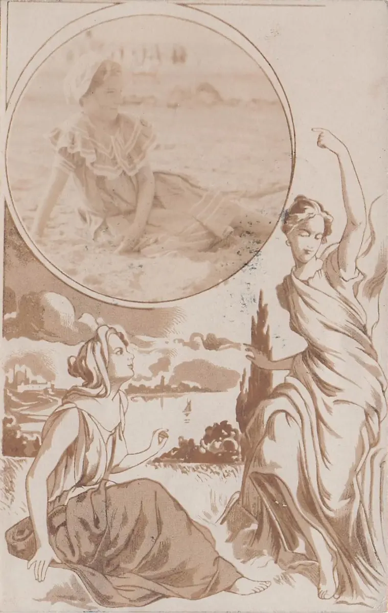 junges Mädchen liegt am Strand . 1910, Fotopostkarte, Jugendstil, Rand, Straßburg -798458