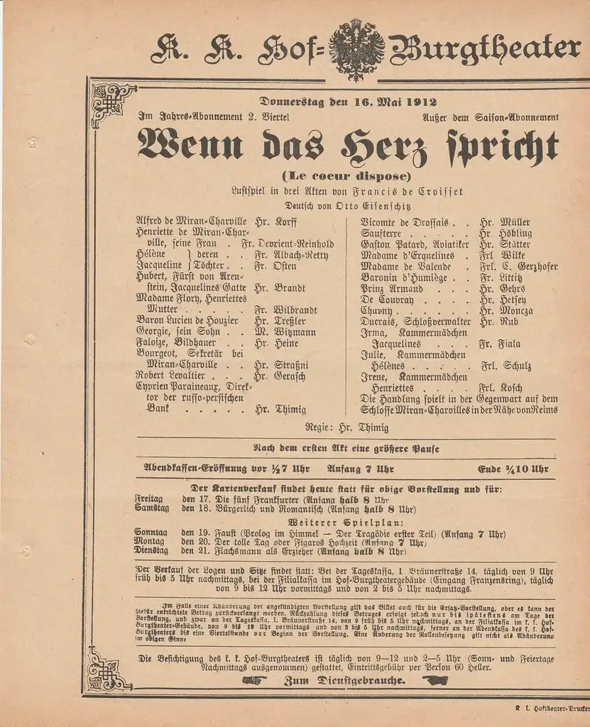 k. k. Hof = Burgtheater Wien: Theaterzettel Francis de Croisset WENN DAS HERZ SPRICHT 16. Mai 1912.