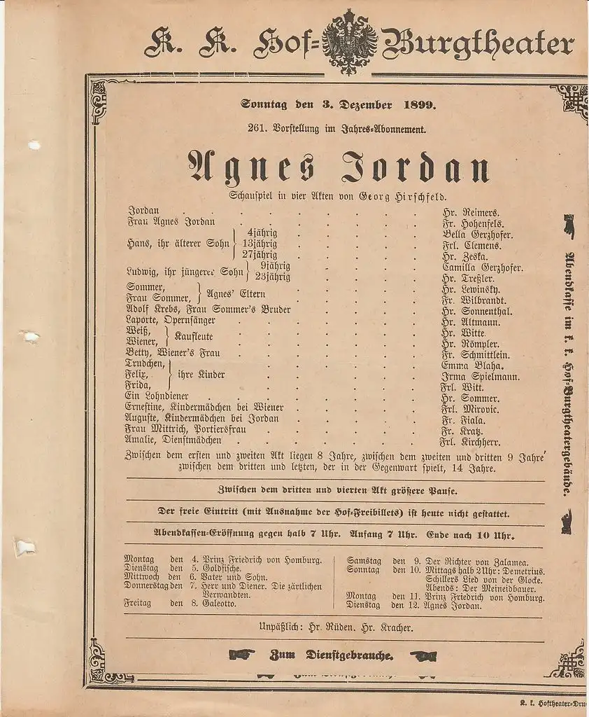 k. k. Hof = Burgtheater Wien: Theaterzettel Georg Hirschfeld AGNES JORDAN 3. Dezember 1899.