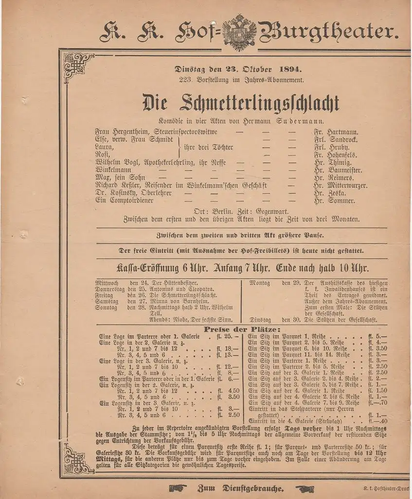 k. k. Hof = Burgtheater Wien: Theaterzettel Hermann Sudermann DIE SCHMETTERLINGSSCHLACHT 23. Oktober 1894.