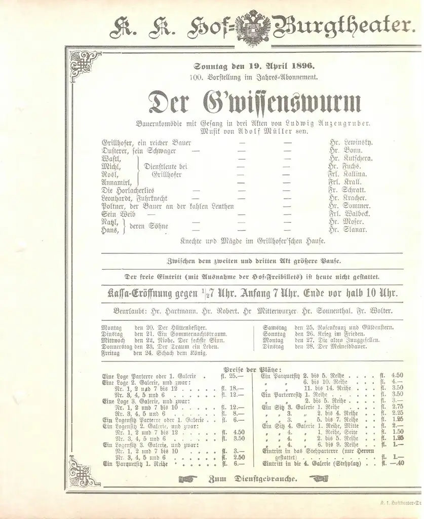 k. k. Hof = Burgtheater Wien: Theaterzettel Ludwig Anzengruber DER G'WISSENSWURM 19. April 1896.