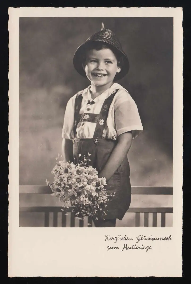 lachendes Kind in Tracht + Blumen, Herzlichen Glückwunsch Muttertag ungebraucht