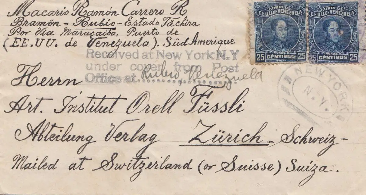 letter from Rubio to Zürich/Switzerland, REceived at NY under Cover from Post