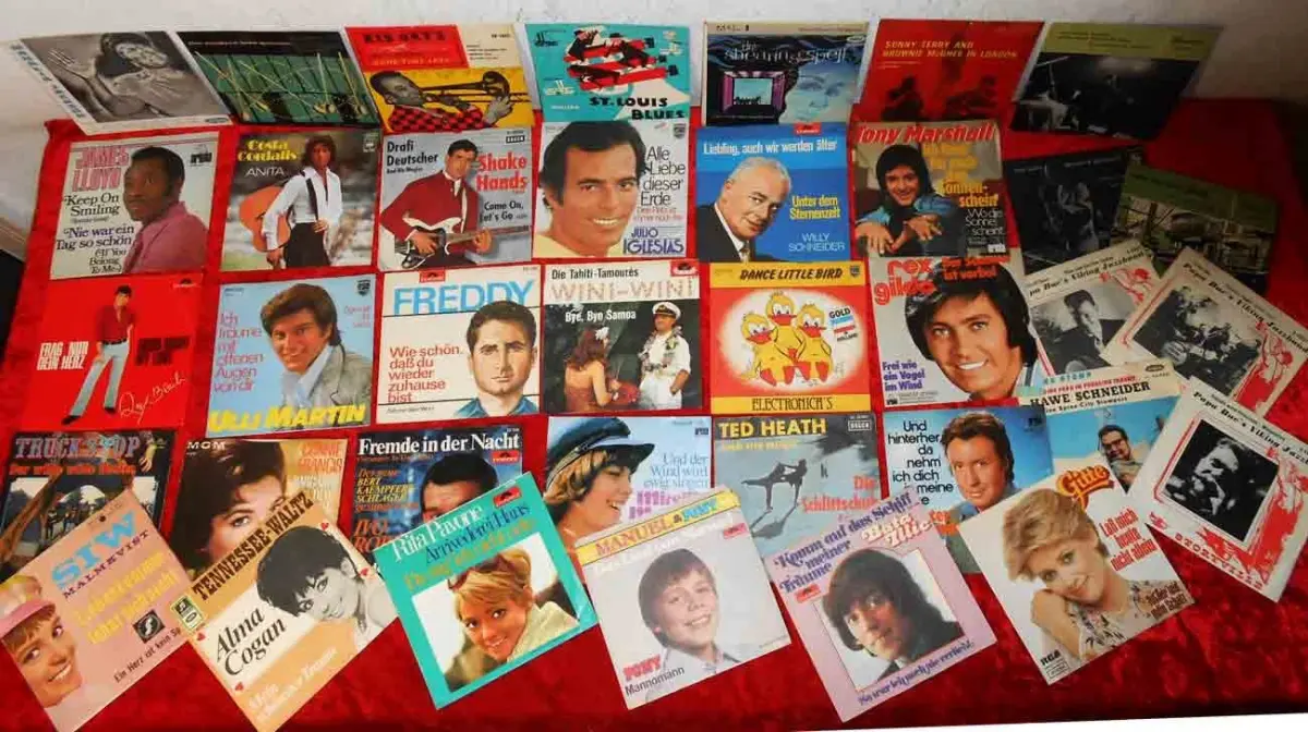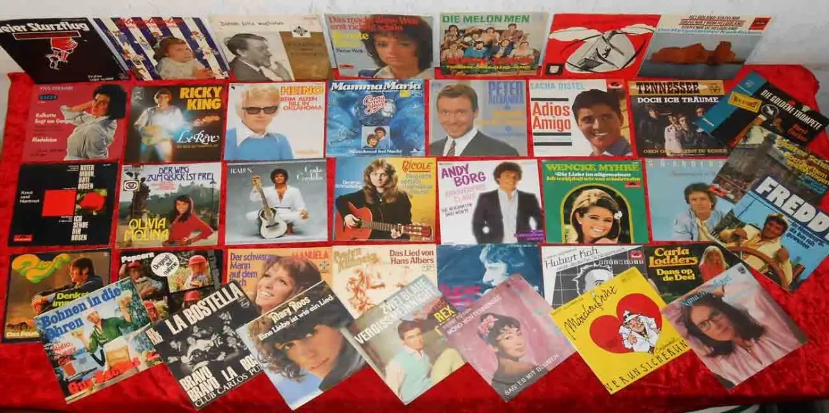 Hier bieten wir eine Sammlung von originalen Singlecovern (Picturecovern) der 50er/80er Jahre (Schwerpunkt 60er/70er) an. Hier werden k e i n e Schallplatten angeboten - nur leere Cover - mehr als 570 Stück Deutsche Schlager, Instrumental und Popmusik; auch Jazz, etwas gesprochenes Wort usw... einige eher seltene Stücke sind dabei.... Aufteilung in etwa: ca. 300 x Deutsche Schlager (1 x Cindy & Bert mit Original Autogramm) / ca. 260 x Internationale Pop- und Rockmusik (1x Weaver Cartwright mit Original Autogramm); ca. 13 x Jazz und Diverses Hier und da können ggf. einige kleine Mängel vorhanden sein (Aufkleber, kl. Einrisse usw…); aber grundsätzlich handelt es sich um Ware in gutem Zustand (meist vg+/vg+). Dabei sind u.a.: Lords Dave Dee Dozy Beaky Mick & Tich Elvis Presley Rattles Rolling Stones Beatles Byrds Who Walker Brothers Searchers Hollies Lee Kings Cinderellas Status Quo Equals Herd T. Rex Eric Burdon & Animals Don Fardon Tea Bachelors Gene Pitney Jeronimo Tornados Eva Pilerova & Karel Gott Bee Gees Blondie Frank Sinatra Peels Marsha Hunt Adam Ant Anna Lena Maywood Osmonds Sandra New Seekers Trogs Ricky Nelson Michel Polnareff Petula Clark Fancy Donna Summer Alphaville Eartha Kitt If Rita Pavone Bobby Goldsboro Cher East Of Eden Al Martino Dana Cardinal Point Oliver Pat Boone Sweet Engelbert Canned Heat Jennifer Rush Shorts Chris Norman William Pitt Silver Convention Mungo Jerry Pia Zadora Cyndi Lauper Adriano Celentano Paul Anka Depeche Mode Marvin Gaye Prince Sade Chris Andrews Pretenders Juliette Greco Los Paraguayos Edward Zanki Windows Freddy Quinn Peter Alexander Paola Siw Malmkvist Reinhard Mey Roberto Blanco Bata Illic Udo Jürgens Manuela Conny Froboess Olivia Molina Chris Howland Ronny Marika Kilius Christian Anders Costa Cordalis Taco Nicki Nena Sacha Distel Hildegard Knef Ralf Paulsen Renate Kern Karel Gott Ulli Martin Chris Roberts Daliah Lavi Maxi & Chris Garden Jürgen Marcus Rudi Schuricke Gitte Johanna von Koczian Mireille Mathieu Mantovani Connie Francis Willem Gisela Jonas Georg Kreisler Roy Black Ulrich Roski Vicky Leandros Rocco Granata Rex Gildo Hans Albers Geier Sturzflug Drafi Deutscher Vico Torriani Nicole Wencke Myhre Nana Mouskouri Lilia Gus Backus Horst Fischer Robert T. Odeman James Lloyd Willy Schneider Tony Marshall Electronicas Alma Cogan Heintje Adam & Eve Dorthe Akki Hamann Johnny Dorelli Cliff Richard Joe Dassin Carmela Corren Billy Mo Billy Vaughn Papa Bue´s Viking Jazzband Hawe Schneider Dave Brubeck Louis Armstrong Kid Ory Sonny Terry & Brownie McGhee George Shearing Modern Jazz Quartet Optische Bewertung