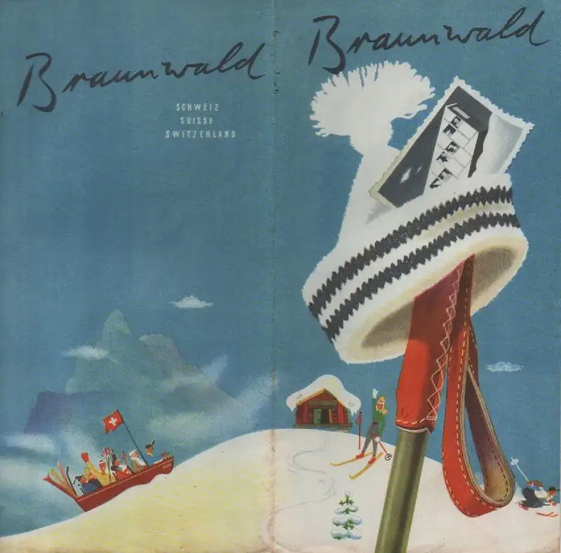 4 Blatt, Normalformat 22 cm, geheftete, farbig illustrierte Broschur, mit Abbildungen (Kupfertiefdruck). Auf Einbandrückseite farbige Panoramkarte von O. Betschmann, Zürich. Hotelverzeichnis von Braunwald (3 Bl.) + Sessel-Bahn Braunwald - Gumen (3 Bl.) innenliegend. Künstlerische Gestaltung des Einbandes Achille Funi.