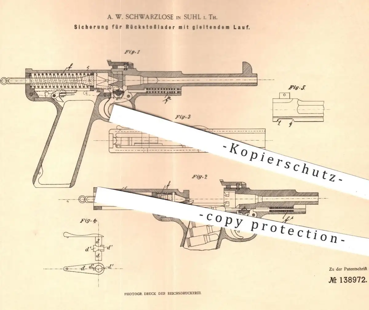 original Patent - A. W. Schwarzlose , Suhl , 1897 , Sicherung für Rückstoßlader | Gewehr , Waffen , Jagd , Militär !!!
