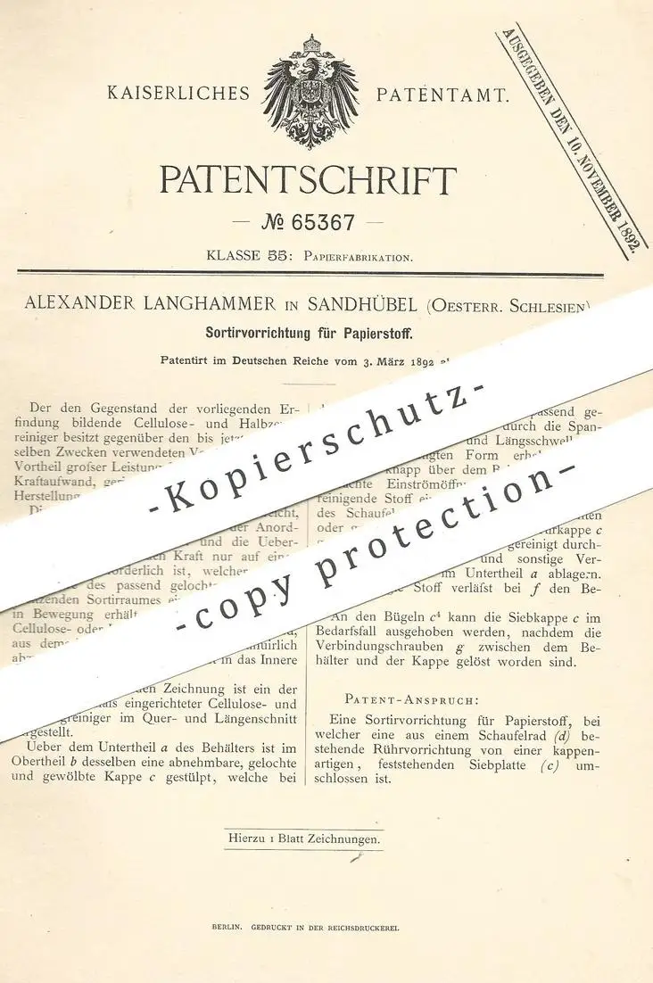 original Patent - Alexander Langhammer , Sandhübel , Schlesien , 1892 , Papierstoff - Sortierer | Papier , Cellulose !!!