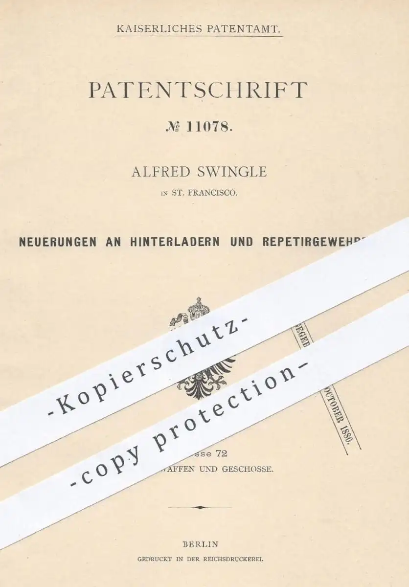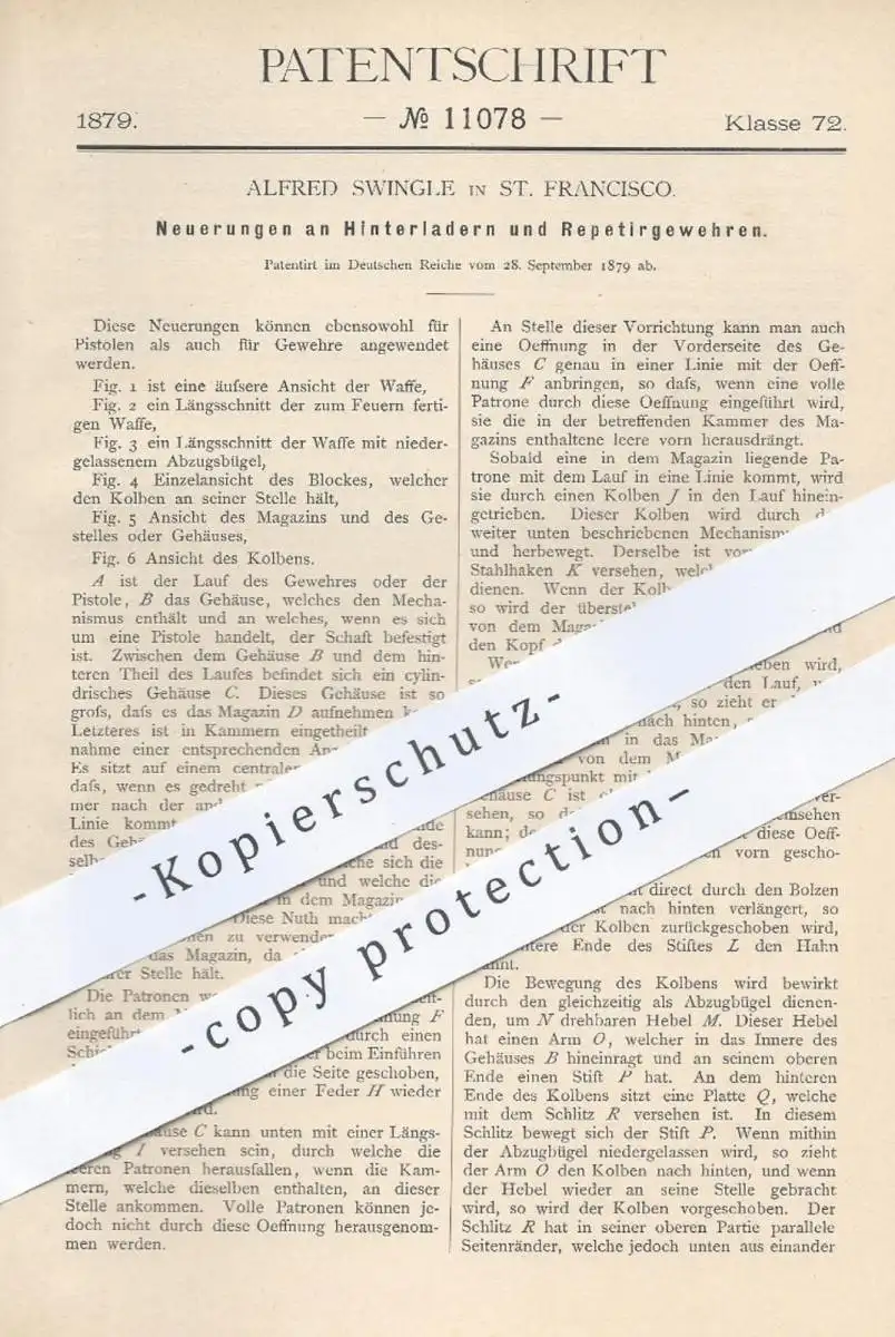 original Patent - Alfred Swingle , St. Francisco USA , 1879 , Hinterlader , Repetier - Gewehre | Waffen , Jagd , Militär