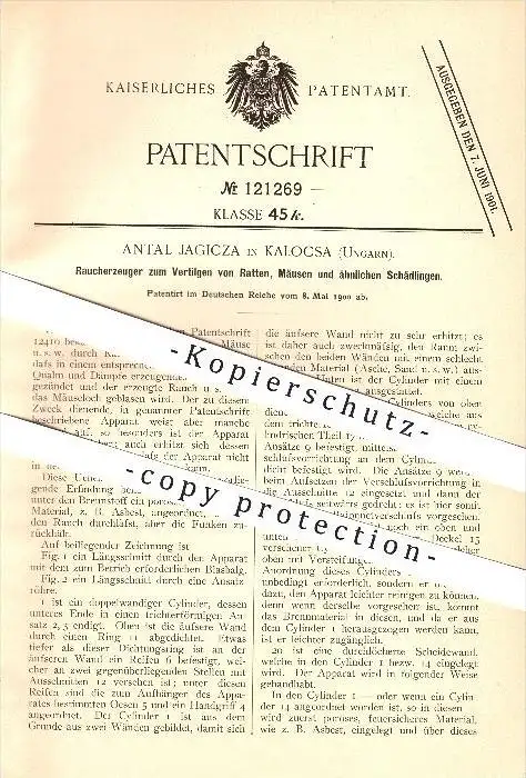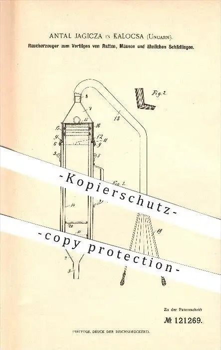 original Patent - Antal Jagicza in Kalocsa , Ungarn , 1900, Raucherzeuger gegen Ratten , Mäuse , Kollotschau !!!